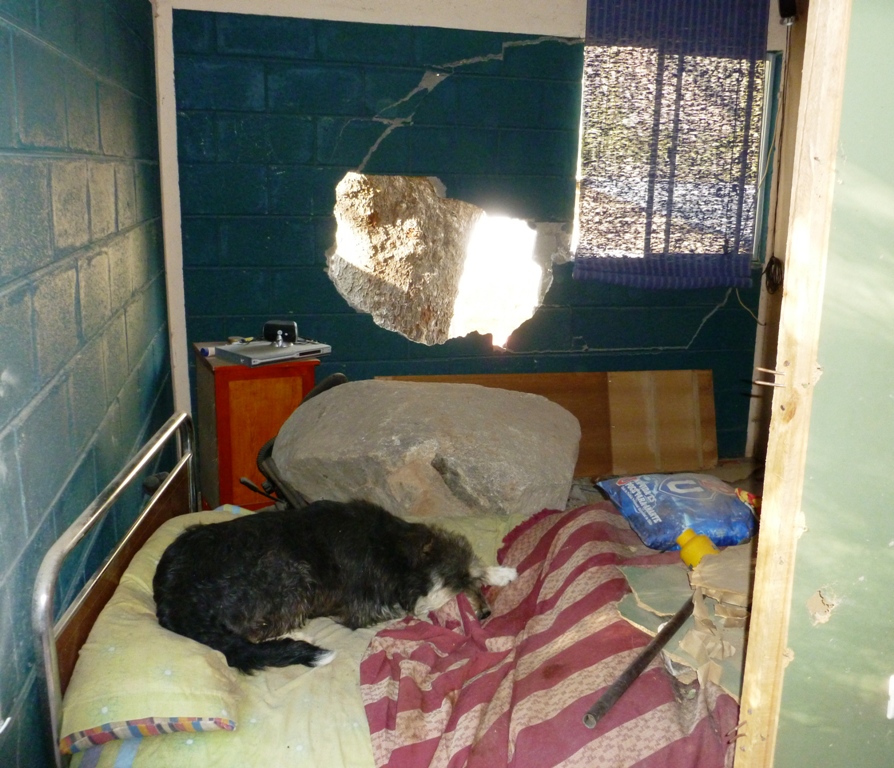 The above photos show Domitila & her nephew (who is one of the adults that live with her), the mountain next to their home showing the section that gave way, the bedroom with a boulder still inside, her replacement basic house with the addition begun, and finally, after three days of work, the addition under rood and taking shape.