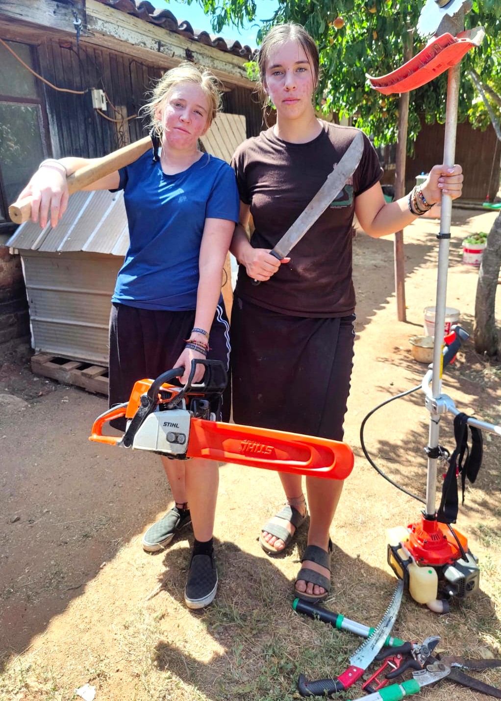 After all of that, the girls spent two & one half days on the camp property helping Abraham & Catalina in a variety of ways, pruning trees, clearing the tent-camping area, and painting metal posts to be used in rebuilding the platform/structure behind Abraham’s house.  TYL!!